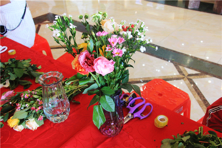 活动台桌上,花篮、工艺剪刀等插花用品排列整齐,琳琅满目