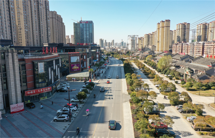 沔街大道上人车通行、车水马龙