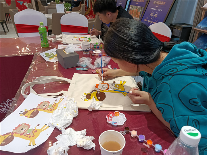 家长和孩子们一起在帆布袋上享受绘画创作的乐趣