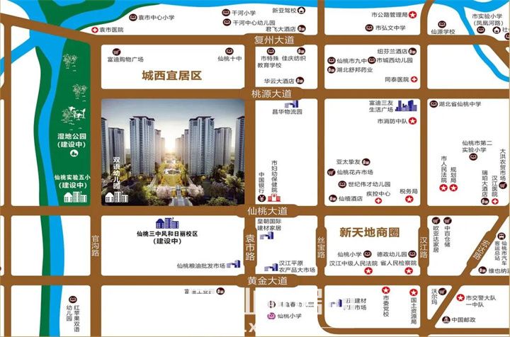 生活配套方面,新农贸大市场、皇朝国际建材家居广场就在项目一街之隔,周边有新天地、富迪三友、德政园三大商圈,另有仙桃市妇幼保健院等配套汇聚。