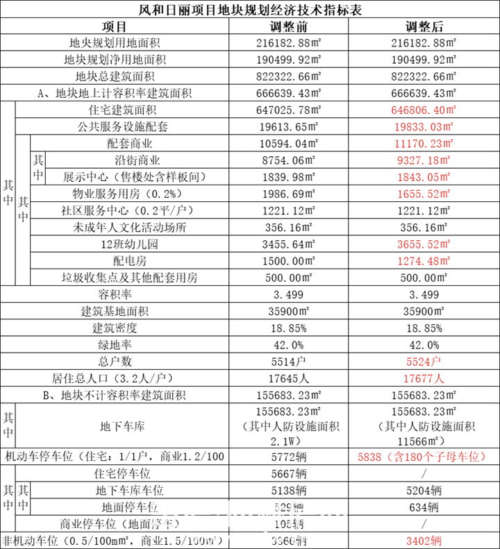 住宅建筑用地面积减少219.38㎡,公共服务设施配套增加219.38㎡,配套商业增加576.19㎡,沿街商业增加573.12㎡,展示中心增加3.07㎡,物业服务用房减少331.17㎡,12班幼儿园增加199.88㎡,配电房减少225.52㎡。