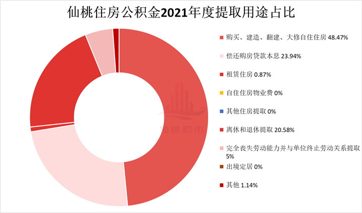 在住房公积金提取金额中,提取用途最多的是用于购买、建造、翻建、大修自住住房,占比48.47%,其他提取用途如下图: