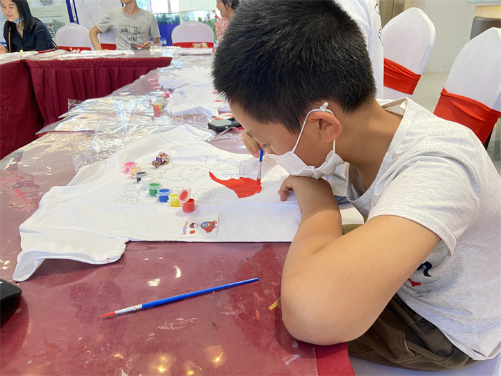 5月4号,创意T恤DIY,当小朋友们的奇思妙想遇上画笔和衣服,又会激起怎样天马行空的小创意呢?T 恤涂鸦开始了,孩⼦们认真的绘画着,尽情享受创作的快乐,大胆的创意,灵动的色彩,精细的手法,认真的思考……