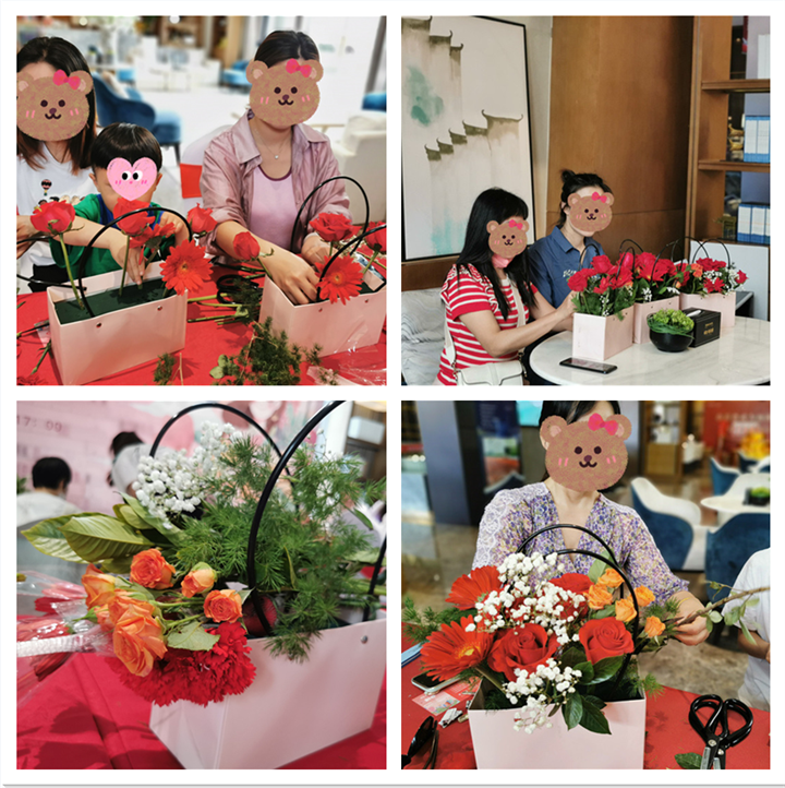 在花艺师的指导下,纷纷制作属于自己的精美花束,一枝枝鲜花被精心修剪、错叠成为了独特、动人的花艺作品。专注、开心和幸福洋溢在每个客户的脸上,美丽的花束花香氤氲,就像母爱般润物无声。