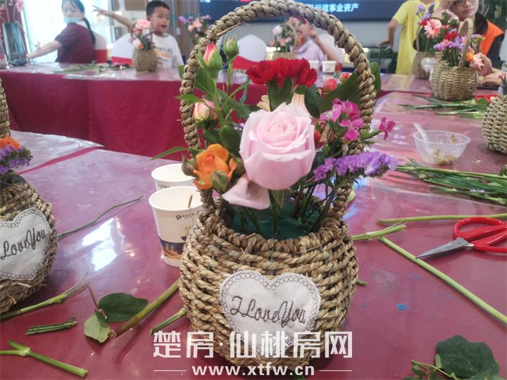 在花艺老师的指导下,每个人都拿起了桌上的花,修剪、插篮、调整……边插花边交流心得,一个个漂亮的花篮作品在欢声笑语中诞生,花香与浓情洋溢在现场的每个角落。