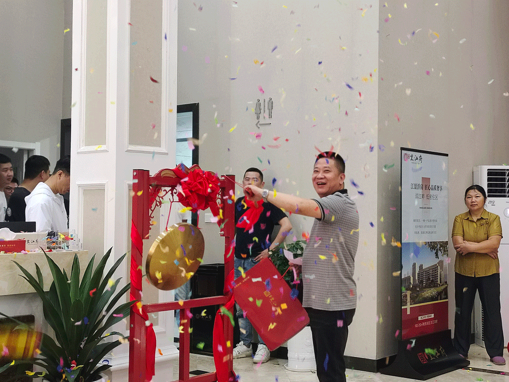 接下来是非常具有仪式感的一个环节:业主敲锣。伴随着响亮的锣鼓声和绚丽多彩的礼花,嘉宾们脸上喜气洋洋。锣声一响,黄金万两;烟花一放,业主兴旺!