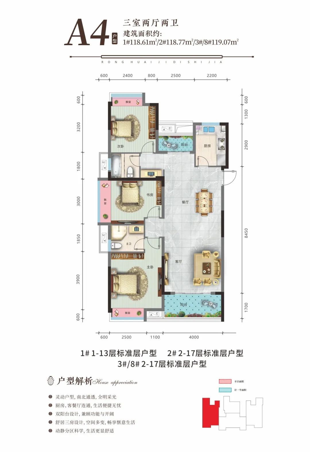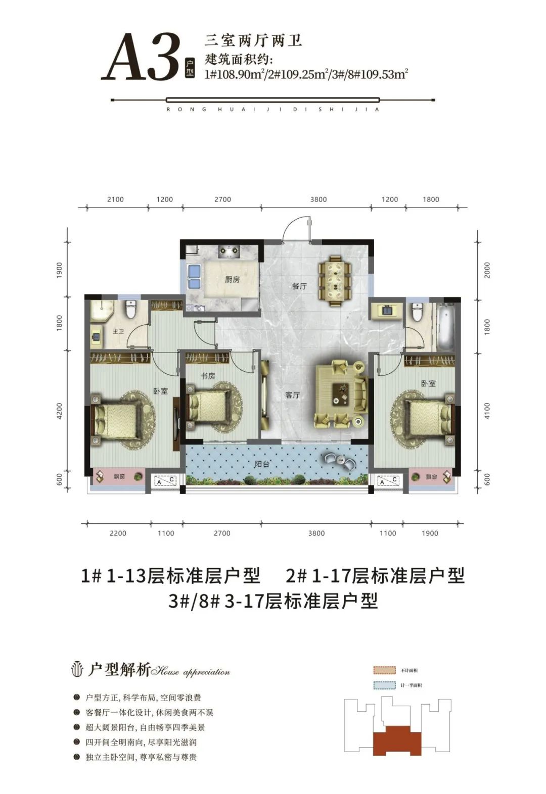 荣怀·及第世家秉承着美好人居产品观念,全面升级户型产品,匠筑建筑面积约107~141㎡全新爆款户型,方正布局,动线合理,全明空间,瞰景大阳台等,打造舒适三居的产品,营造更美好的生活方式。