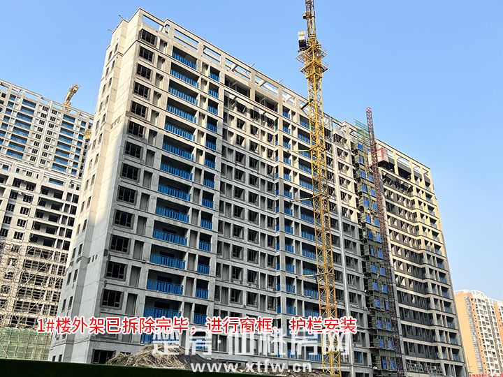 (1#楼外架已拆除完毕,进行窗框、护栏安装)