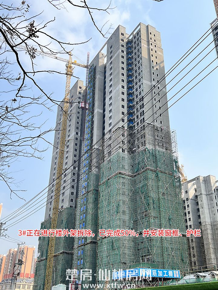 3#正在进行楼外架拆除,已完成50%,并安装窗框、护栏