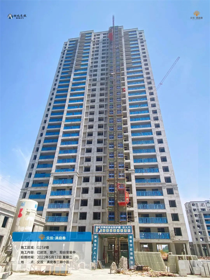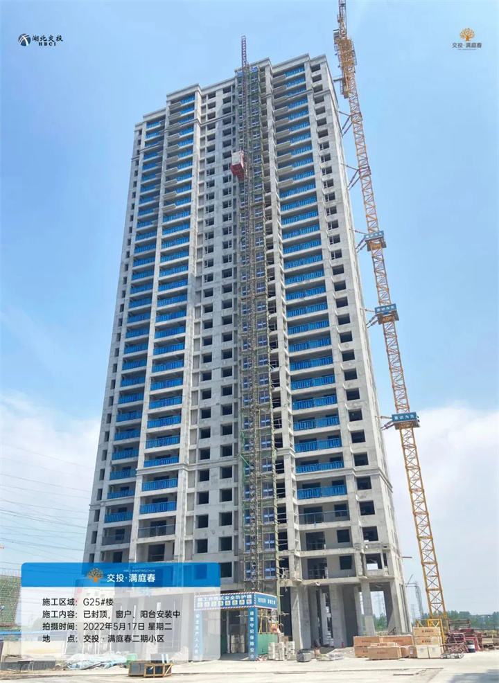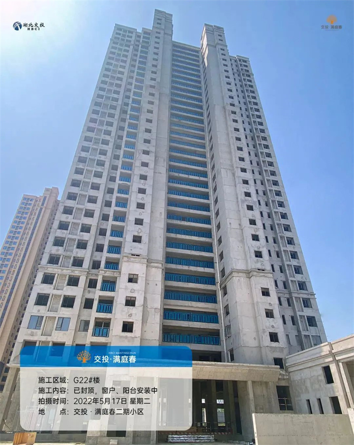 项目二期高层G22/G23/G25号楼已封顶,外立面正在施工中,窗户、阳台围栏等正在安装中;