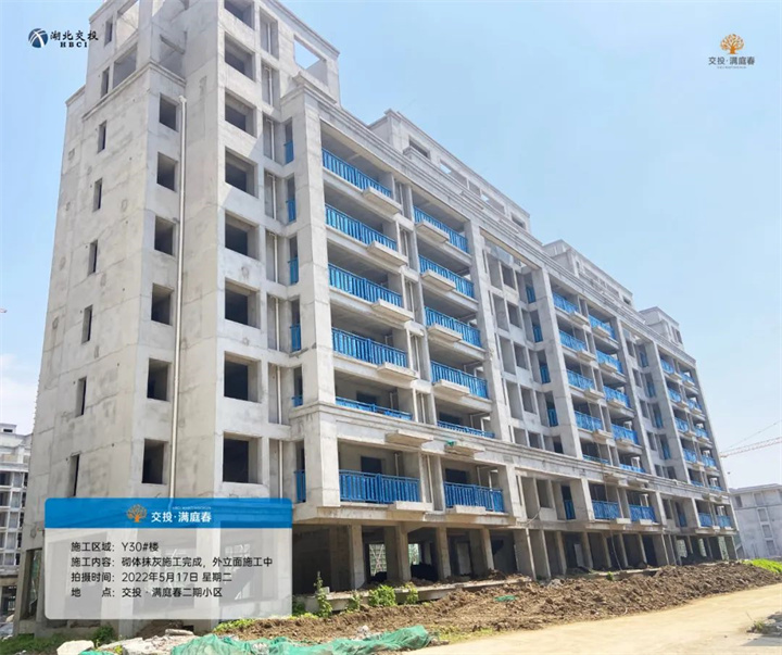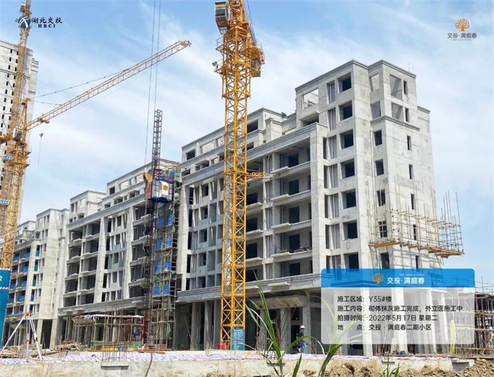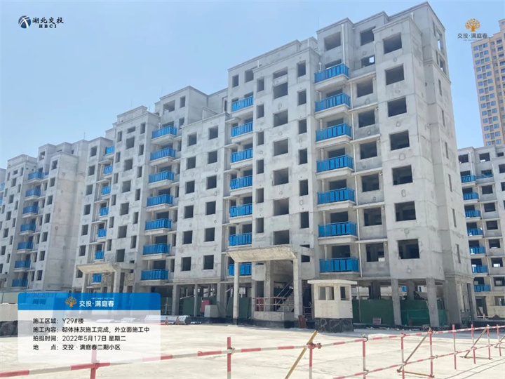 项目二期洋房Y28/Y29/Y30/Y33/Y35号楼已封顶,砌体抹灰施工完成,外立面正在施工中,窗户、阳台围栏等正在安装中;