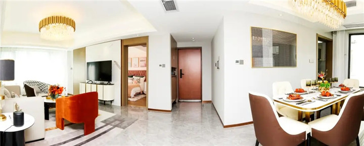 空间尺度,盛载时光丰盈。金科·御府建面约115~117㎡三室户型以宽阔客厅设计,构建更大的采光面和通风效果,让整个客厅都充满阳光。拉长与窗外美景的生活尺度,营造宽居生活的美好享受。在这里,既能满足茶余饭后亲友闲话家常、会客交友,又能满足孩子嬉戏的空间,轻松容纳亲友相聚的温馨时光。