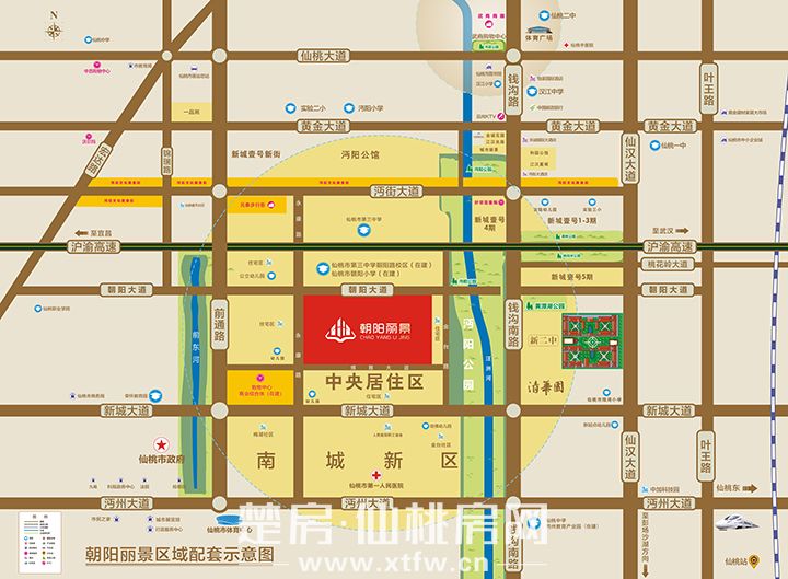 其中教育,医疗,商业三大主要生活配套一个不少:项目正北侧有在建的仙桃三中朝阳校区(小学初中),沔阳公园旁就是新二中,东南角就是仙桃中学,正大门旁有公立幼儿园,步行可达;