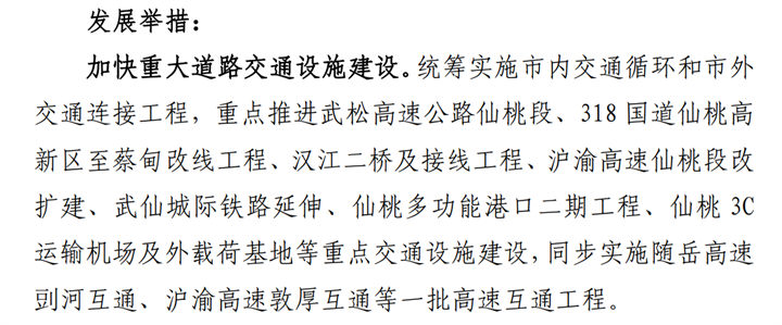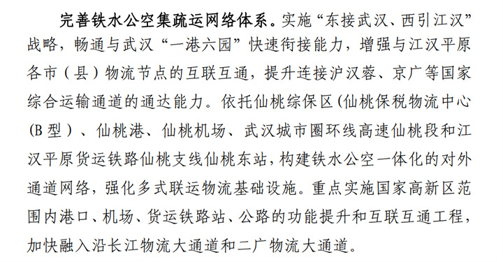 将努力构建完善“十二纵六横”的干线公路网,打造武汉城市圈西翼区域交通枢纽、江汉平原物流集聚区、国际特色专业物流节点,建成鄂中物流枢纽,争创集约型国家物流枢纽。