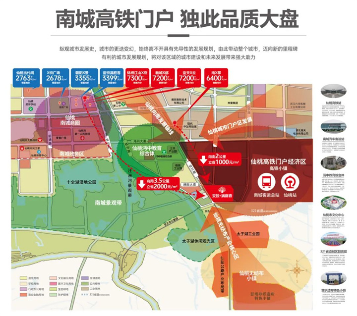 项目立足南城新区中轴之上,板块内汇聚了代表城市价值的全部业态,商业、教育、生活、医疗、市政配套......包括市政府、检察院、九局、市民之家、艺术文化中心、人民医院、仙桃站、南城客运站、奥体中心(规则中)、仙桃中学新校区(规划中)等优质资源。