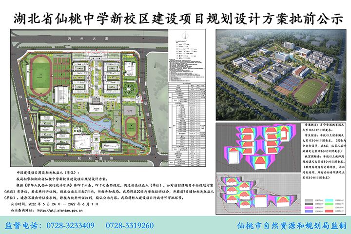 根据最新的规划,仙桃中学新校区选址在南城新区,项目地址位于钱沟路东侧、沔州大道南侧。项目方案总平面图、效果图、日照分析图如下:
