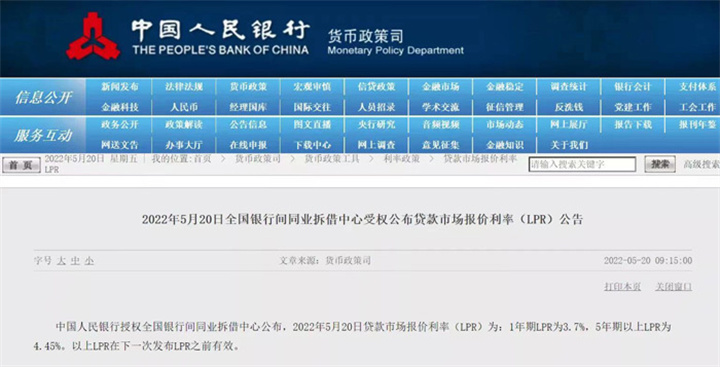 2022年5月20日贷款市场报价利率(LPR)为:1年期LPR为3.7%,5年期以上LPR为4.45%。相比4月20日的4.6%,五年期LPR本次下调了15个基点。