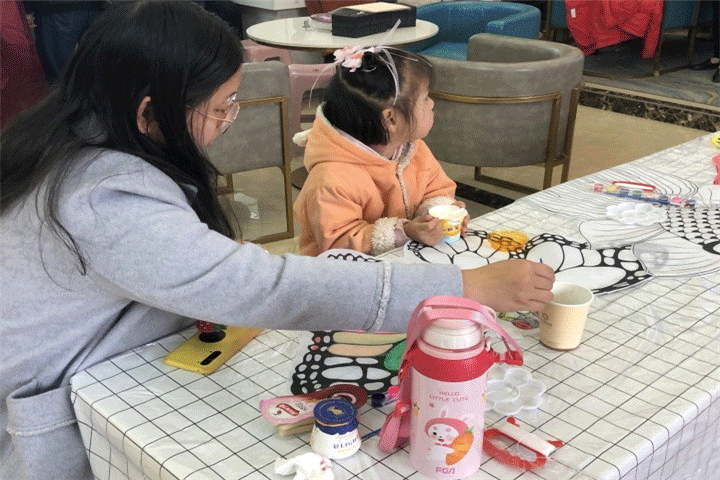 活动现场热闹非凡,活动现场的每一位家长和孩子们,孩子们两三挂满了灿烂的笑容,手里拿着画笔,涂抹着自己喜爱的风筝图案,塑造着他们心中即将绽放的翅膀。