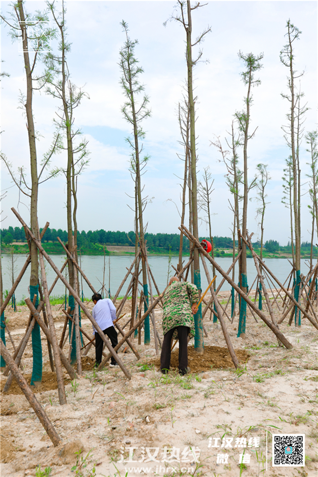 沿着河堤向东走,直至汉江大桥,全长约5KM,园林绿化面积高达36.52万平米,园建施工面积约2万平方米。目前,临路的绿化已栽种成形,园林人员正在为其松土。