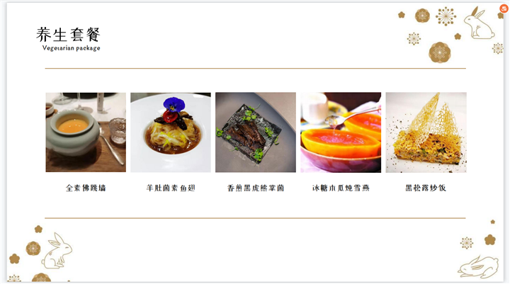 全素佛跳墙、羊肚菌素鱼翅、香煎黑虎熊掌菌、冰糖木瓜炖雪燕、黑松露炒饭等