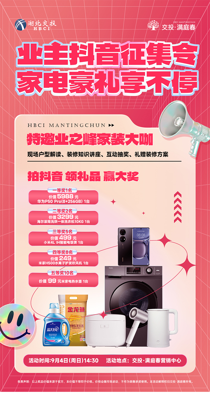 保留好您所拍抖音作品,参与抖音征集令的业主于9月4日前往交投·满庭春营销中心可参与整点抽奖活动。