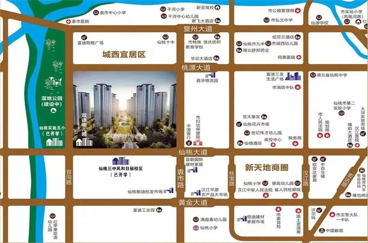 风和日丽项目内规划幼儿园,与实验五小、仙桃三中仅一路之隔,可以满足12年全龄教育。