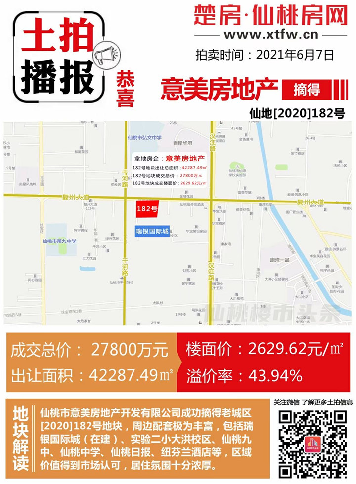 项目所在的地块是意美地产在2021年6月7日以2629元/㎡的楼面地价拿下,溢价率43.94%,一举成为城西地王,到现在近两年城西并无商服住宅用地拍卖成功。