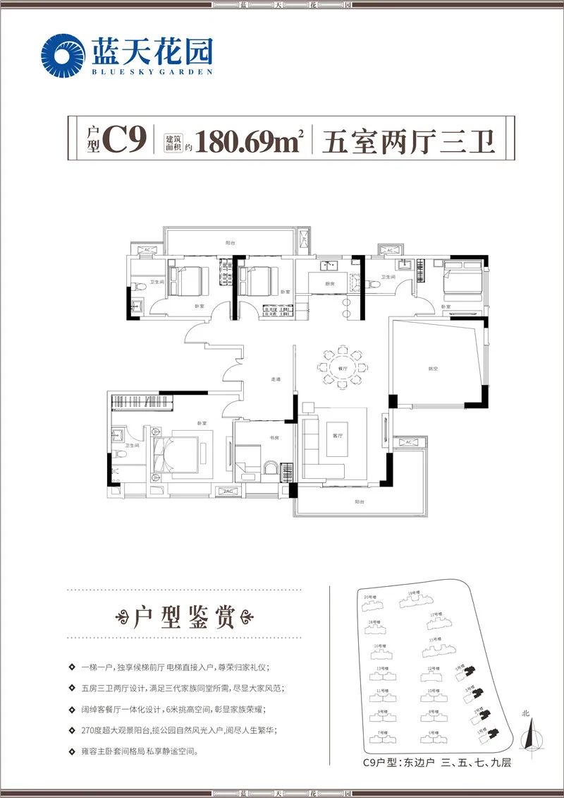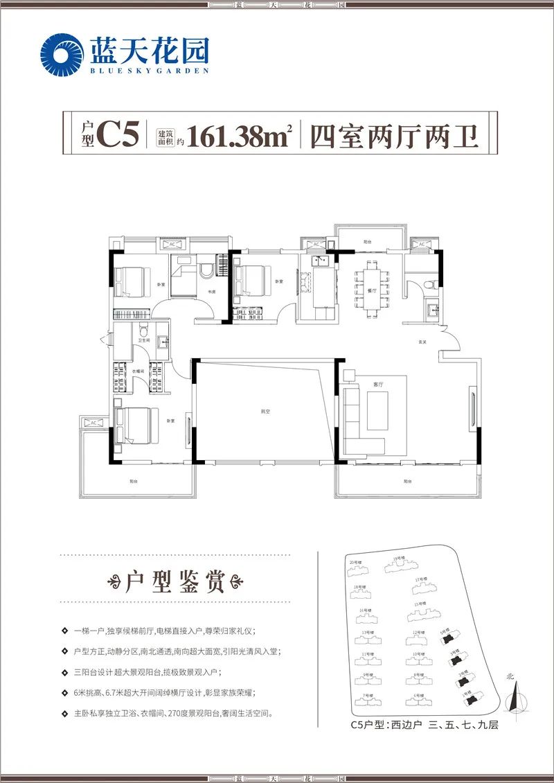 目前在售户型为建面约99-190㎡的宽境生态美宅、悦景小高层等。其中99㎡-130㎡为三居室,141㎡-161㎡为四居室,181㎡为五居室。以下是蓝天花园在售主要户型: