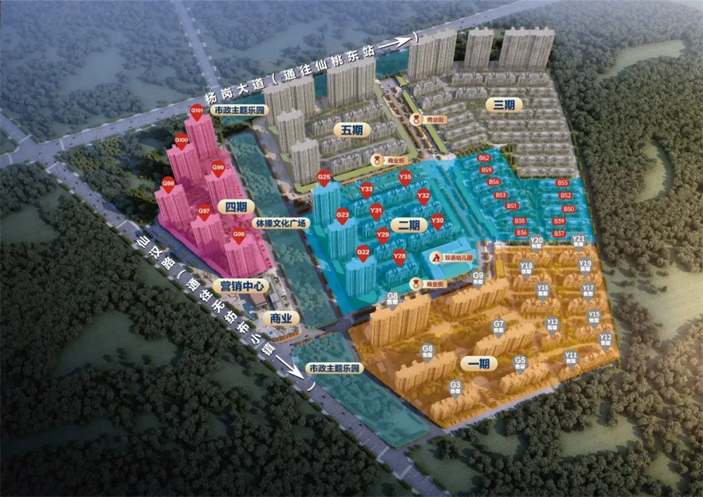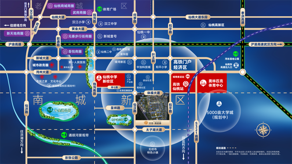交投·满庭春位于南城新区,杨岗大道与仙汉路交汇处。基地西侧紧邻仙汉大道,可直达中芯老城区;东侧有仙桃高铁站,可通过在建杨岗大道快速到达。
