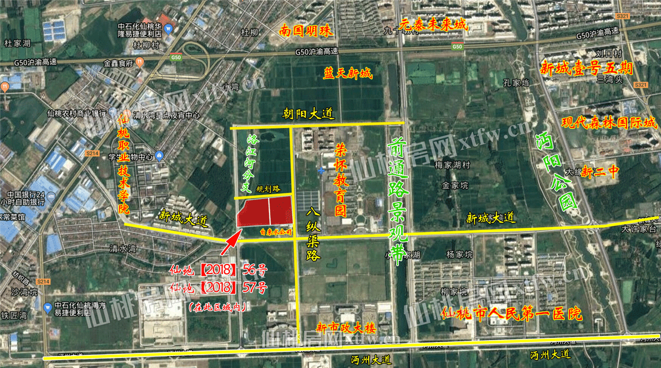 ①仙地【2018】56号具体位于博雅大道以南、八纵渠以西,仙地【2018】57号在洛江河以东、博雅大街以南,两宗地相邻。东面是荣怀▪及第世家项目,西临洛江河支流,南靠南城新区自来水公司水务维修中心。
