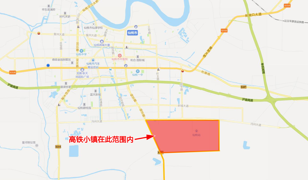 高铁小镇与仙桃城铁站相距较近,大概位置是北至沔州大道,西至彭场大道,南至体操大道,东至纱帽路,用地面积约8.27平方公里。其中以铁路车站为中芯,小镇核芯区范围约2.7平方公里。