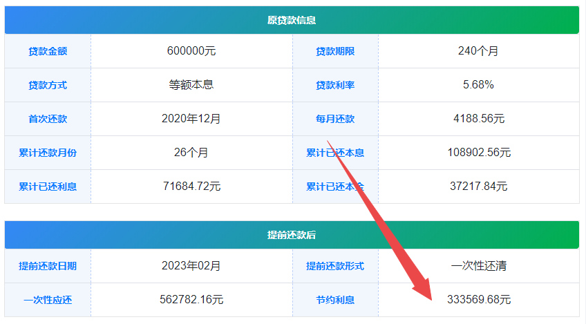 如果持续按合同还款,需支付的利息将达到本金的三分之二。现在提前还款,可以节省33万多的利息!