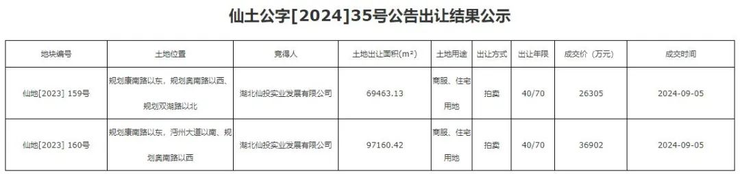 仙地[2023]159号用地位置规划康南路以东,规划奥南路以西、规划双湖路以北,土地出让面积为69463.13㎡;仙地[2023]160号地与此地块相邻,土地出让面积为97160.42㎡,160号地北面即是沔州大道。两块地均为商服、住宅用地。