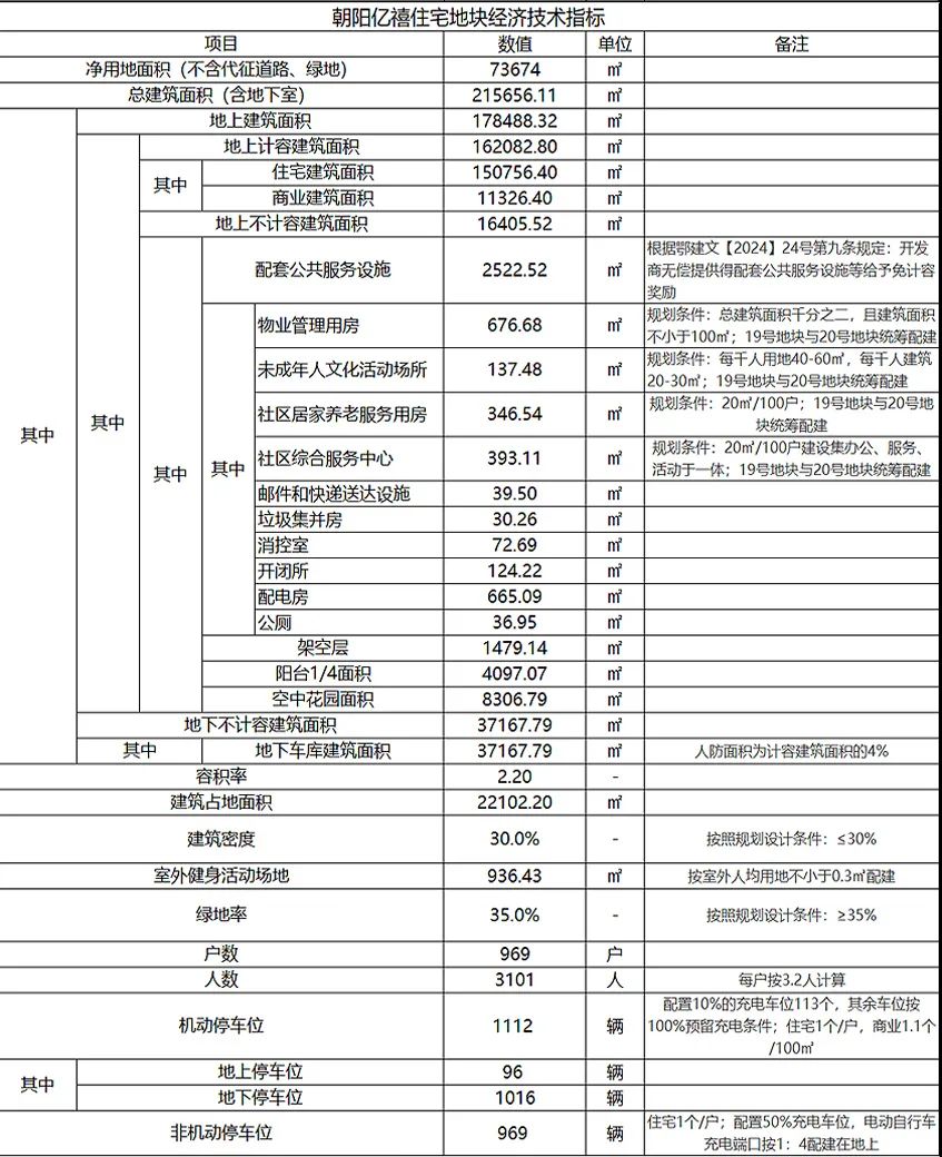 朝阳亿禧住宅地块取消幼儿园建设规划,规划户数调整为969户(3101人),机动车停车位调整为1112辆(地上96辆,地下1016辆),非机动停车位调整为969辆。