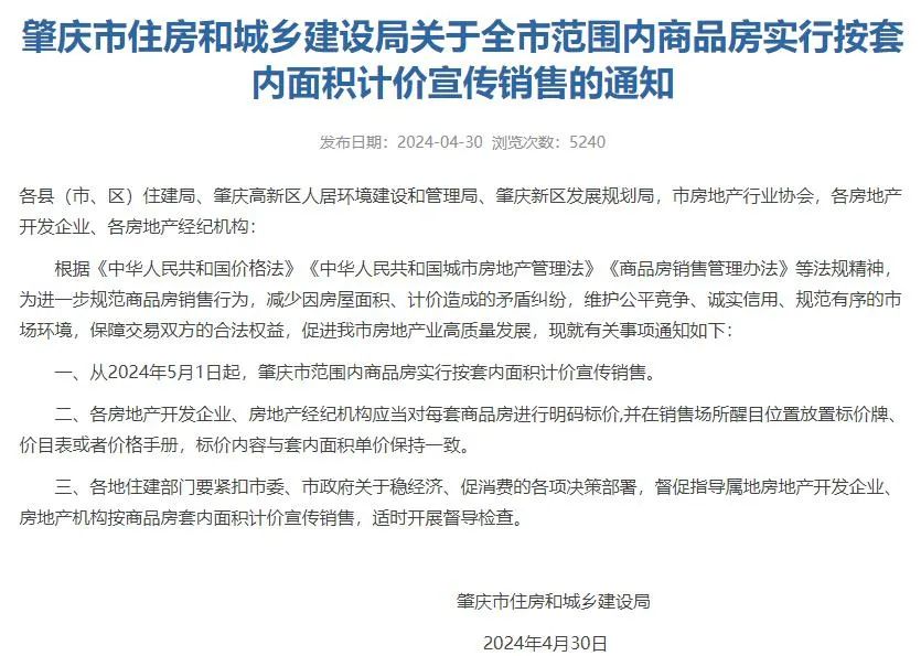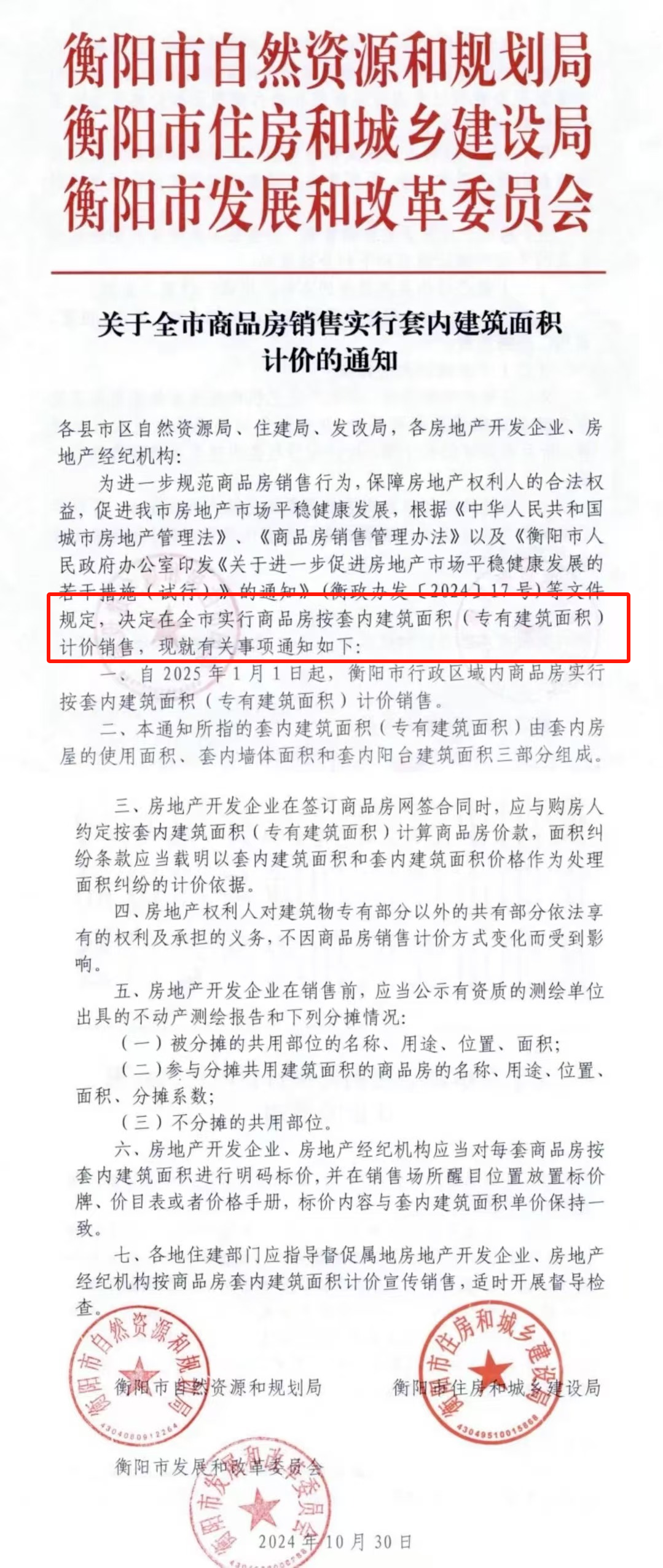 12月12日,湖南衡阳市更是发布红头文件《关于全市商品房销售实行套内建筑面积计价的通知》,明确自2025年1月1日起,衡阳市商品房销售实行套内建筑面积计价。