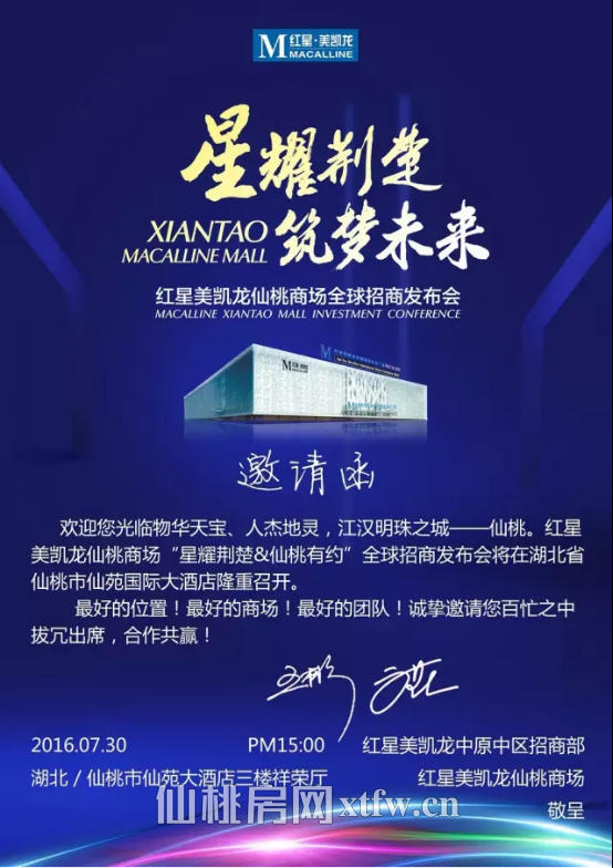 商场如战场,唯有睿智之人,方能运筹帷幄,掌控先机!谁将是下一个家居大佬?红星美凯龙将告诉您答案!7月30日,红星美凯龙仙桃商场全球招商发布会将启幕,届时政府领导、全国家居品牌、知名媒体、知名商业巨头将应邀出席这场规模的招商,共话仙桃家居未来之辉煌!红星美凯龙仙桃商场与您携手共创家居新篇章。新常态、新机遇、新启航,见证一座MALL沸腾一座城。