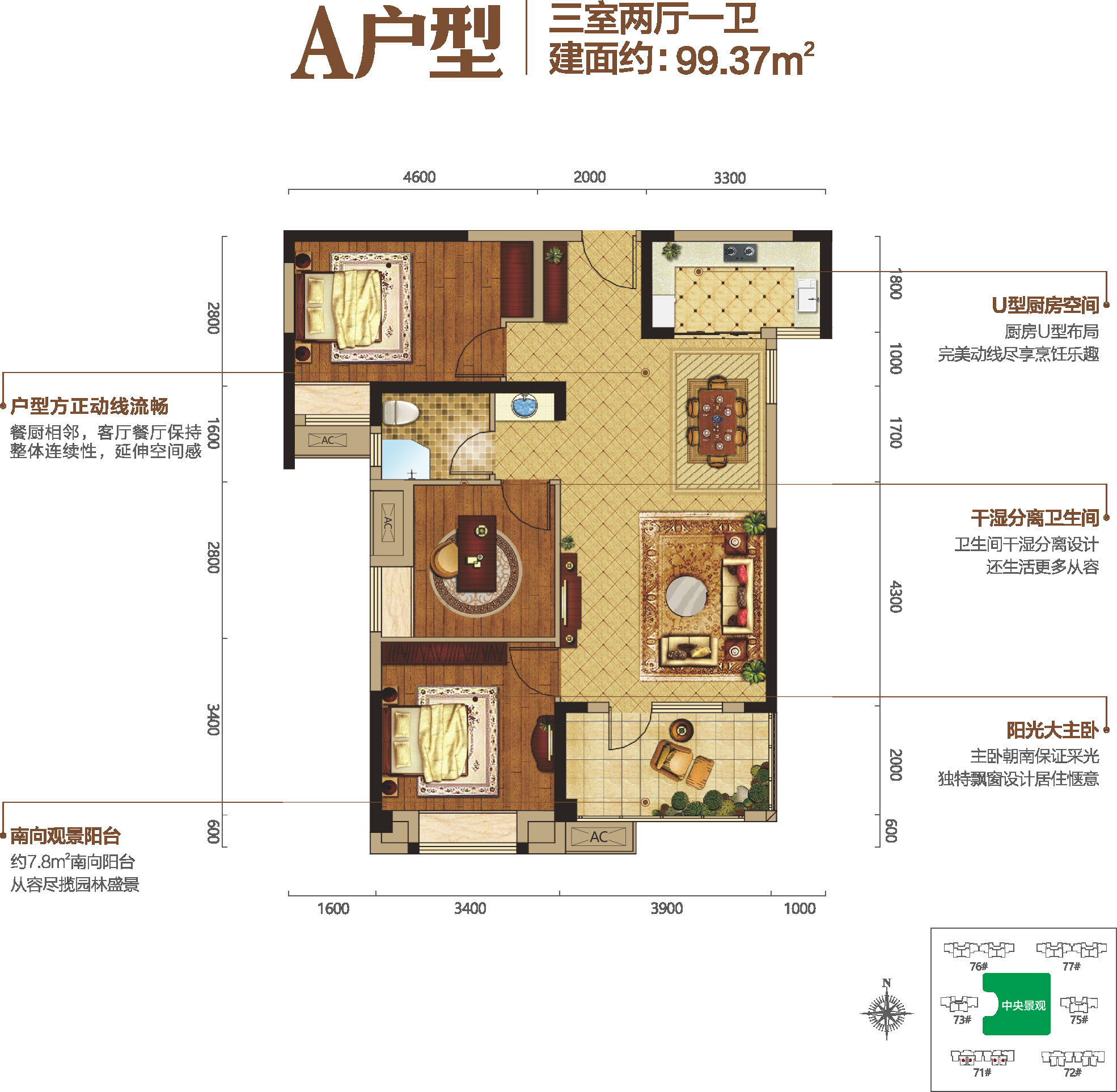 户型方正动线流畅 南向景观阳台 U型厨房空间 干湿分离卫生间 阳光大主卧